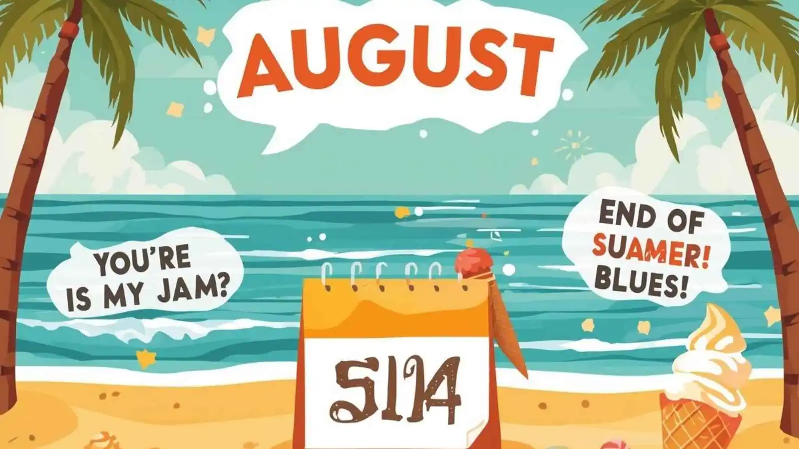 Bright August beach scene with calendar and hilarious original puns floating in speech bubbles.